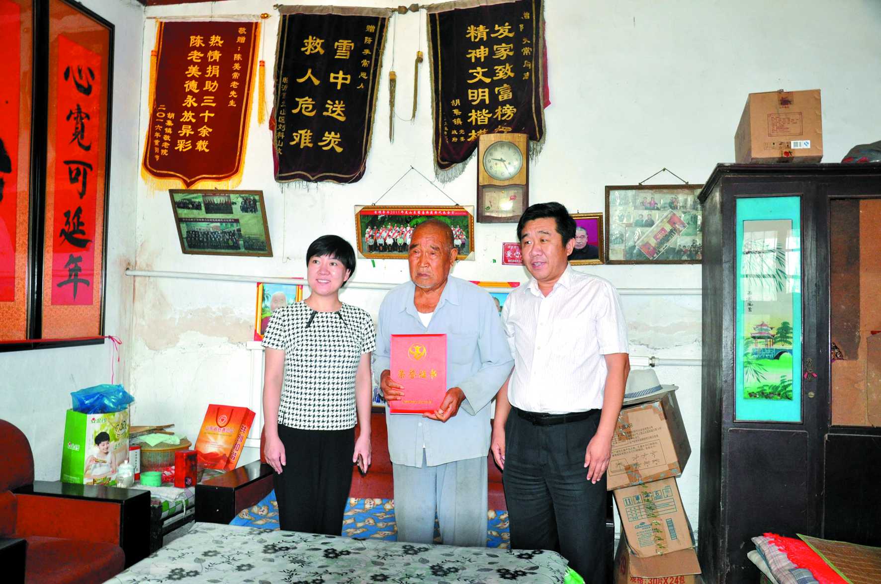 8月30日,在胡集镇河沟陈村陈美常家中,老人激动地从市老龄办副主任宫会亮手中接过了“全国敬老爱老助老模范人物”荣誉证书。