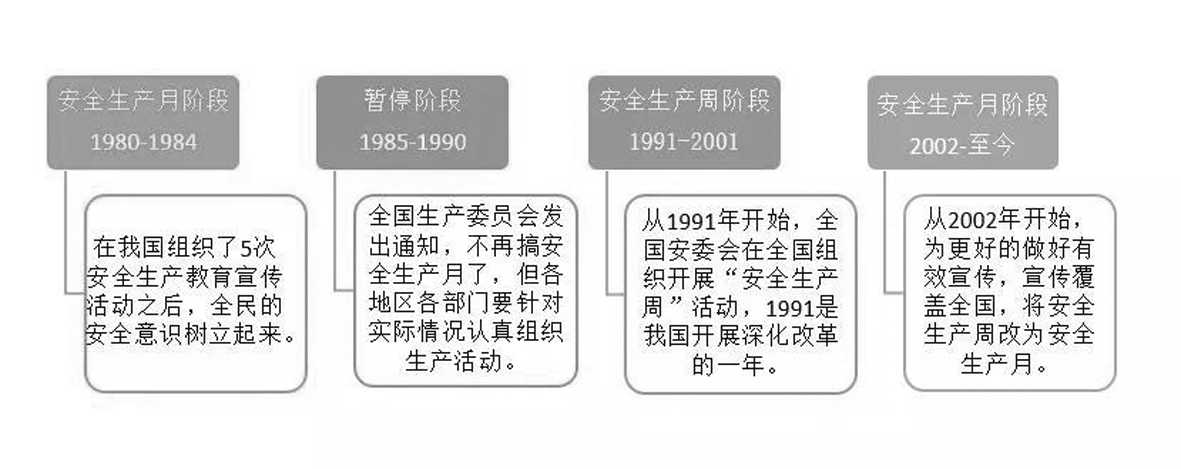 安全生产月是经国务院批准,由国家经委、国家建委、国防工办、国务院财贸小组、全国总工会和中央广播事业局等十个部门共同作出决定,于1980年6月在全国开展安全月活动,这也是我国首次开展安全生产月,并确定每年6月都开展安全月活动,使之经常化、制度化。期间这一活动经历了下面四个阶段:
