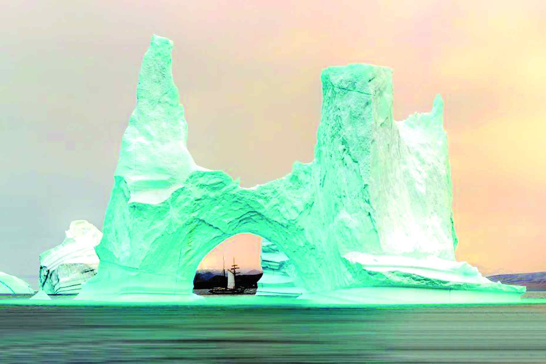 近日,一名摄影师在格陵兰岛捕捉到了一副风景如画的景象,一艘双桅帆船精完美地嵌入了格陵兰岛沿岸一座巨大的水蓝色冰山中间的拱门之中,看起来既精致又美妙。据悉,这名摄影师名叫詹姆斯拉什沃思(James Rushworth),来自英国。当天,32岁的詹姆斯为了这张合影,冒着低至零下10摄氏度的气温在格陵兰岛的海上耐心地等待着,当双桅帆船正好位于冰山拱门中间,他按下了快门。照片中,长108英尺(约33米)的双桅帆船在300英尺(约91.5米)高的冰山衬托之下,显得十分袖珍,令人不禁感叹。对此,詹姆斯表示:“我们出海航行时恰巧看到了这些大冰山。拍照时我在那艘双桅帆船的姊妹船上,跟着帆船刚好可以确定拍摄角度。我们十分小心,不能离得太近,怕冰山会突然倒塌,掀起巨大海浪。拍照前我注意力特别集中,拍完了我就坐在那儿欣赏冰山美景了,真的实在是太美了。”
