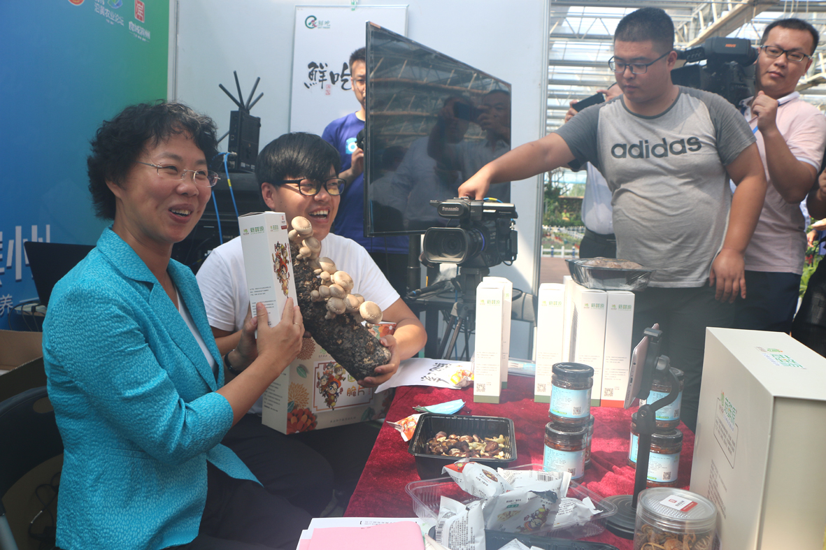 9月16日,庆祝中国农民丰收节——2019首届沿黄现代农业论坛在我县举办。期间,一场互联网和农产品相结合的营销活动在鑫诚现代农业科技示范园举行,150余家企业线上、线下推销自己的特色农产品。县委书记殷梅英来到我县齐发果蔬有限公司展位,“客串”网络主播,线上吆喝卖香菇。