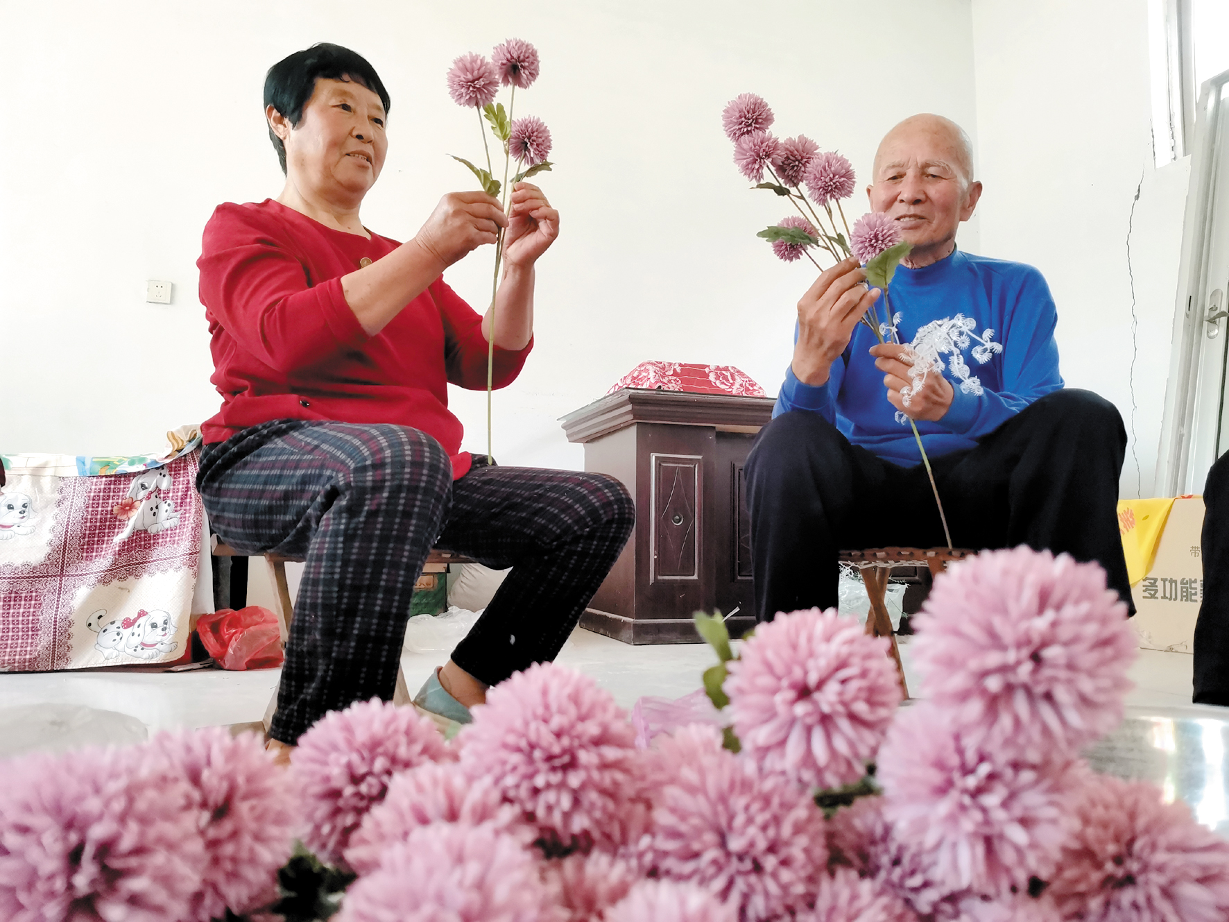近日,在桑落墅镇梁家村村民梁双喜的家里,五六个邻居正有说有笑的从事仿真花加工。