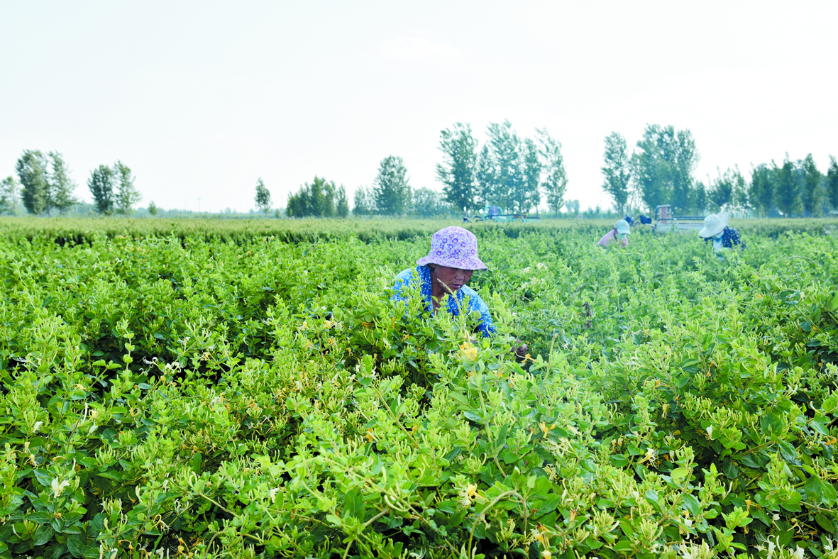 近日,胡集镇月杨社区任家村南的金银花地里,四五个村民正在采摘金银花。