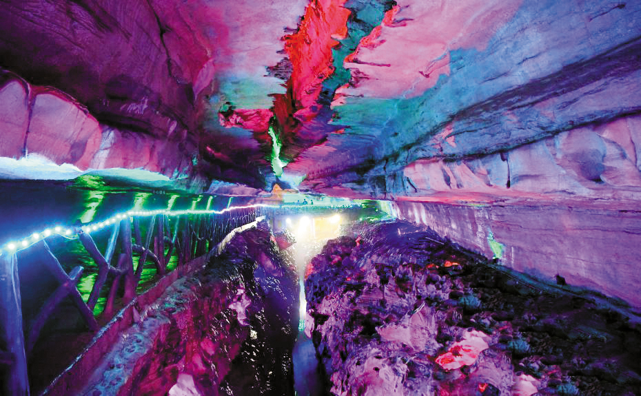 近日,游客在湖北省襄阳市保康县九路寨生态旅游区黄龙洞参观。湖北省襄阳市保康县不仅地面风光旖旎,当地独特的喀斯特地貌形成的溶洞等地下美景,构成了保康大山独特的“地下风景线”。黄龙洞位于国家4A景区——湖北省襄阳市保康县九路寨生态旅游区,洞深达600余米。洞内五光十色、形状各异的钟乳石、石笋、溪流等自然景观,千姿百态,河流、溶洞等美景相映成趣,成为当地发展生态旅游的新亮点。(陈泉霖 摄)